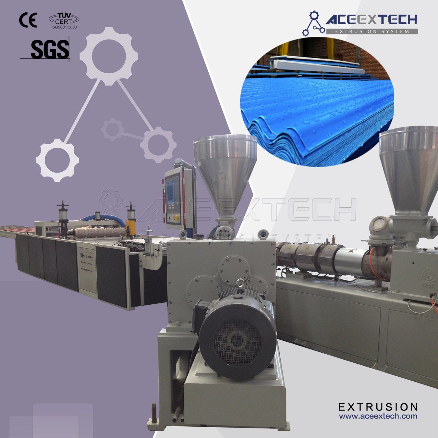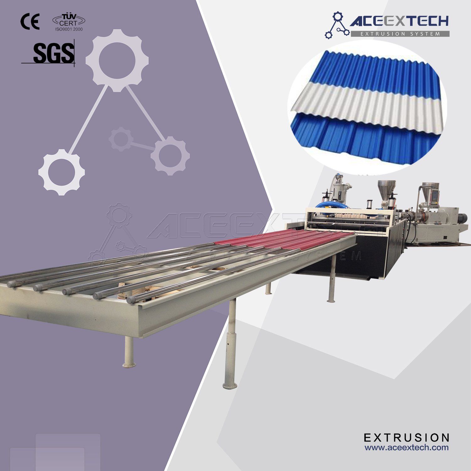 - Specification: 1130mm PVC trapezoid roofing tile extrusion line