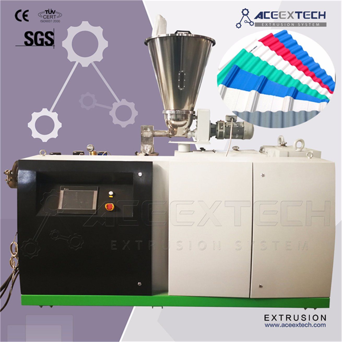 Co-extruder | • World famous brand electrical component such as Siemens,Schneider, ABB etc; • High torque gearbox with adopts NSK/SKF bearing; • Siemens/WEG original motor achieved global after service; • Intelligent PLC controlling system with human-friendly interface. |