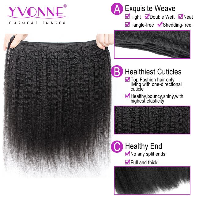 Advantage: | Soft, no tangle and no shedding. Our hair is 100% virgin hair without proccessing and dying. It's natural color (natural black with little brown).you can dye, bleach, iron as well. After wash, it returns same texture. |