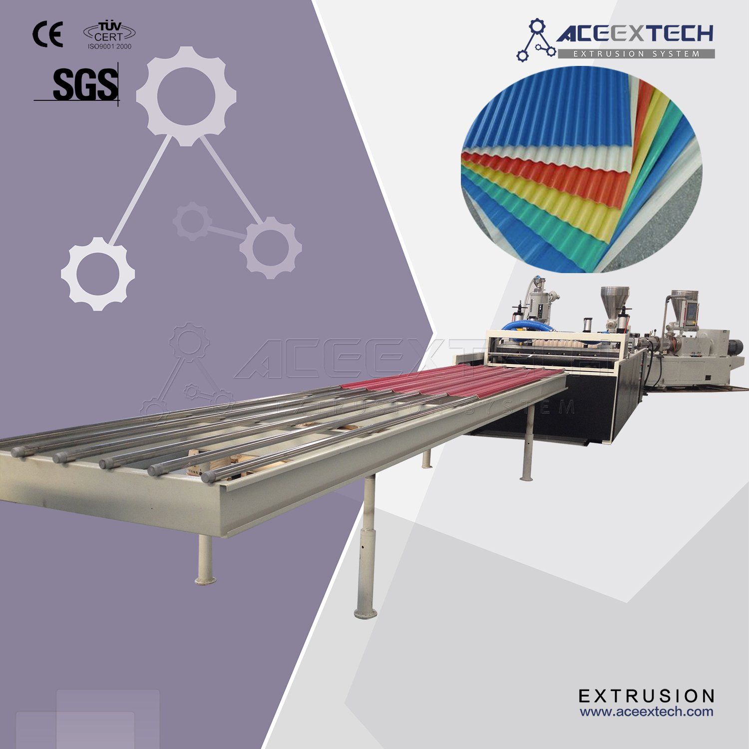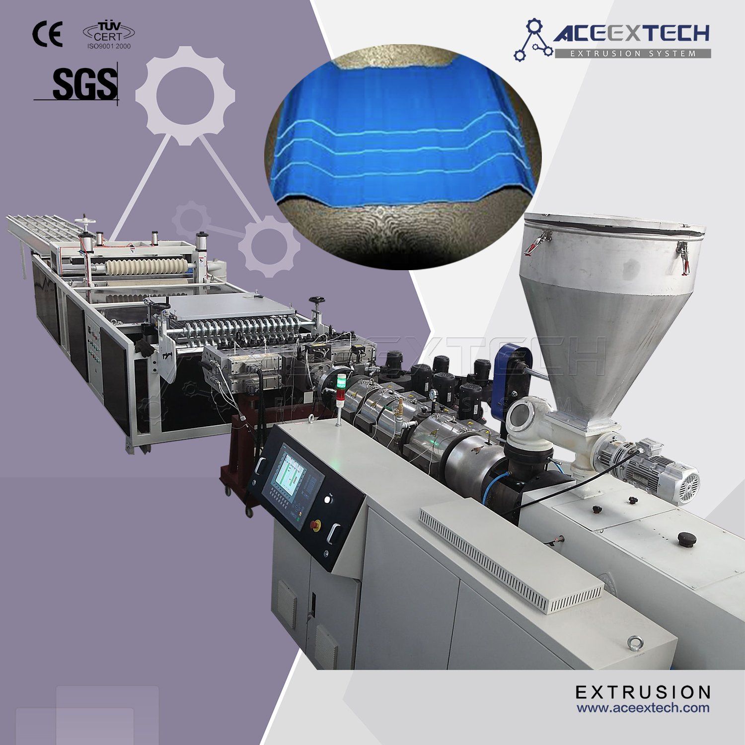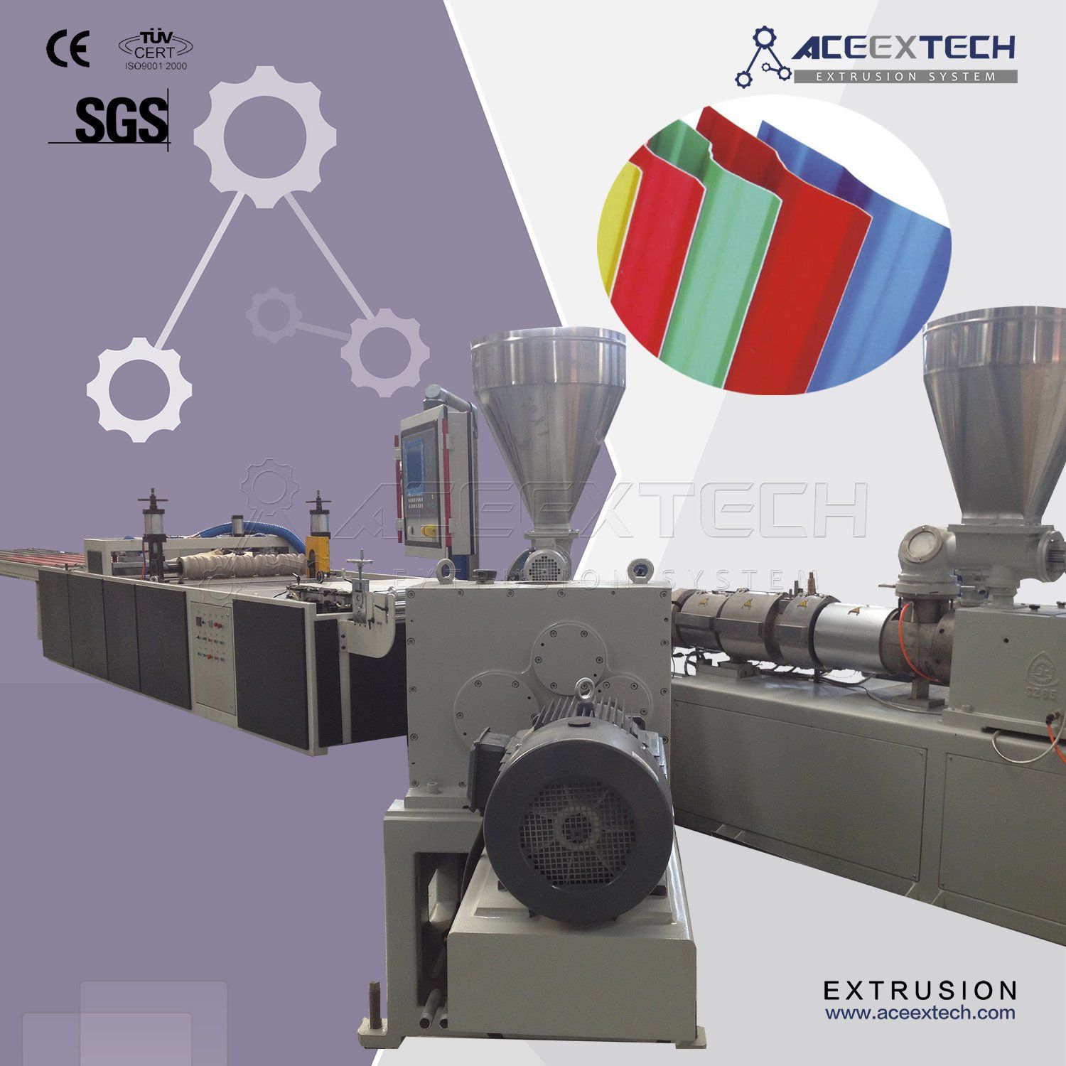 Foamed PVC corrugated roof tile making machine for production of customizes different solutions according to clients' demands on product structure, shape which has width from 720mm to 1130mm and thickness from 0.8